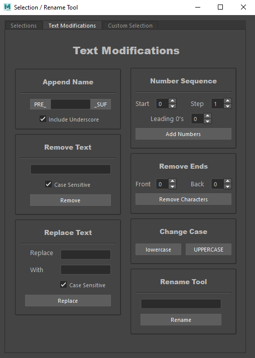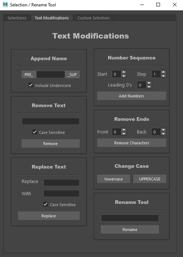 Easy renaming tools allow the user to keep their scene neat and organized as quickly and efficiently as possible.